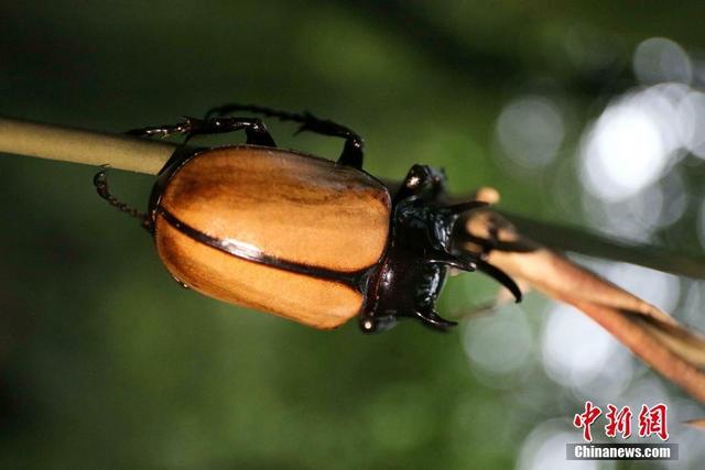 六足及前胸黑亮,前胸背上有着4个短角,头上还有一条黑色弯曲的犄角,造型犹如犀牛,非常独特美丽。 赵力 摄